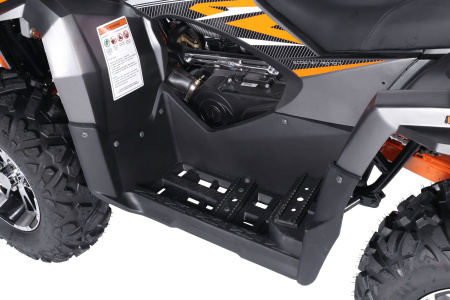Безопасность движения обеспечивается эффективной тормозной системой: гидравлические дисковые тормоза спереди и сзади (двойные спереди) позволяют остановить квадроцикл за 7 метров. Передняя и задняя подвески с амортизаторами делают движение максимально комфортным, а диаметр колес в 580 мм с вакуумными шинами обеспечивает устойчивость и хорошее сцепление с поверхностью. Максимальная нагрузка в 180 кг позволяет использовать квадроцикл как для одного райдера, так и для перевозки грузов или пассажира.